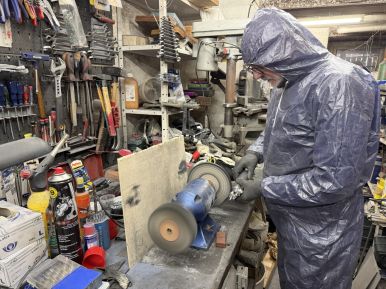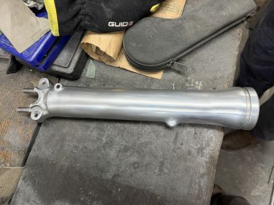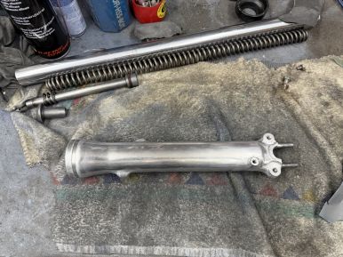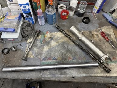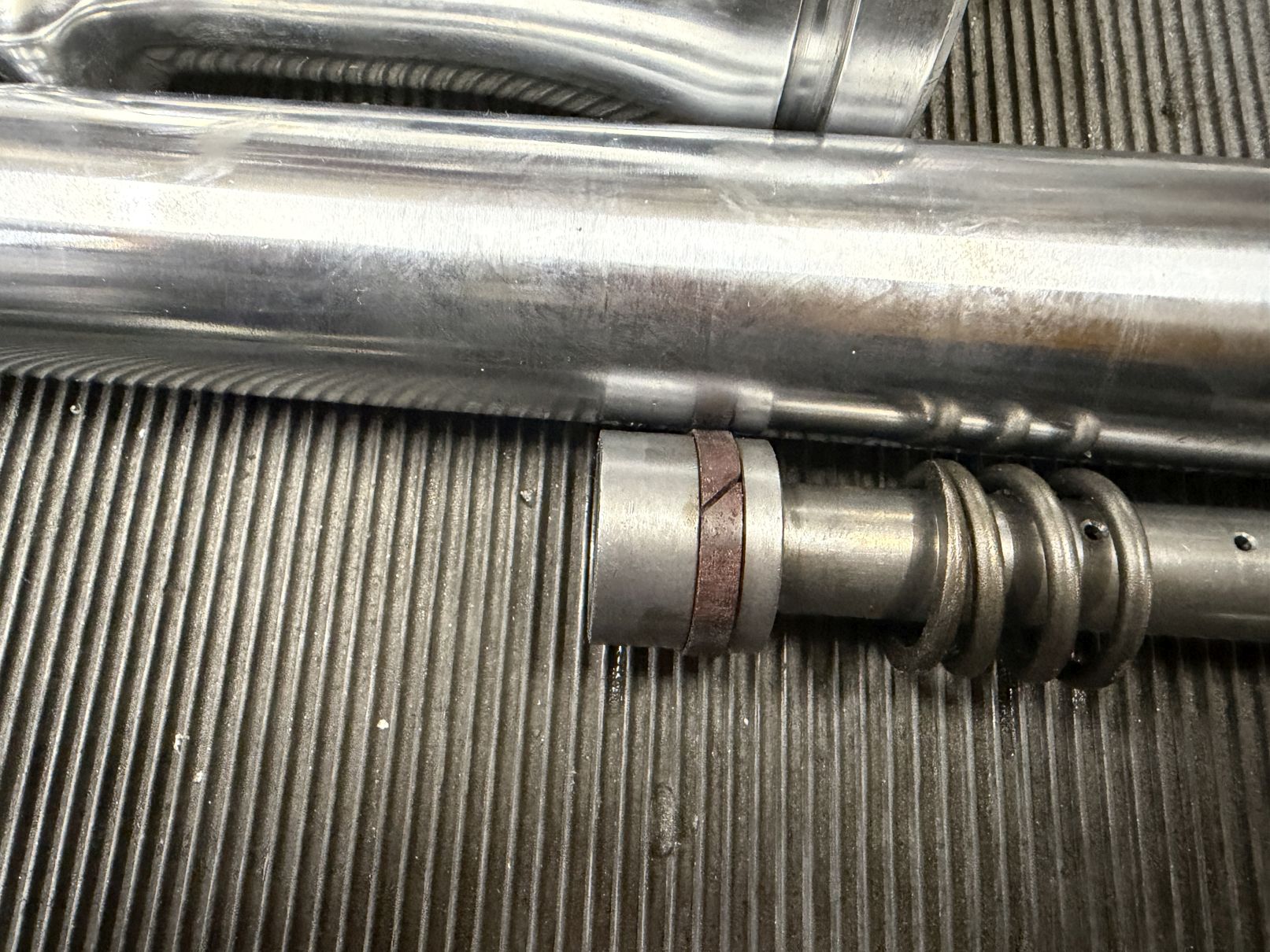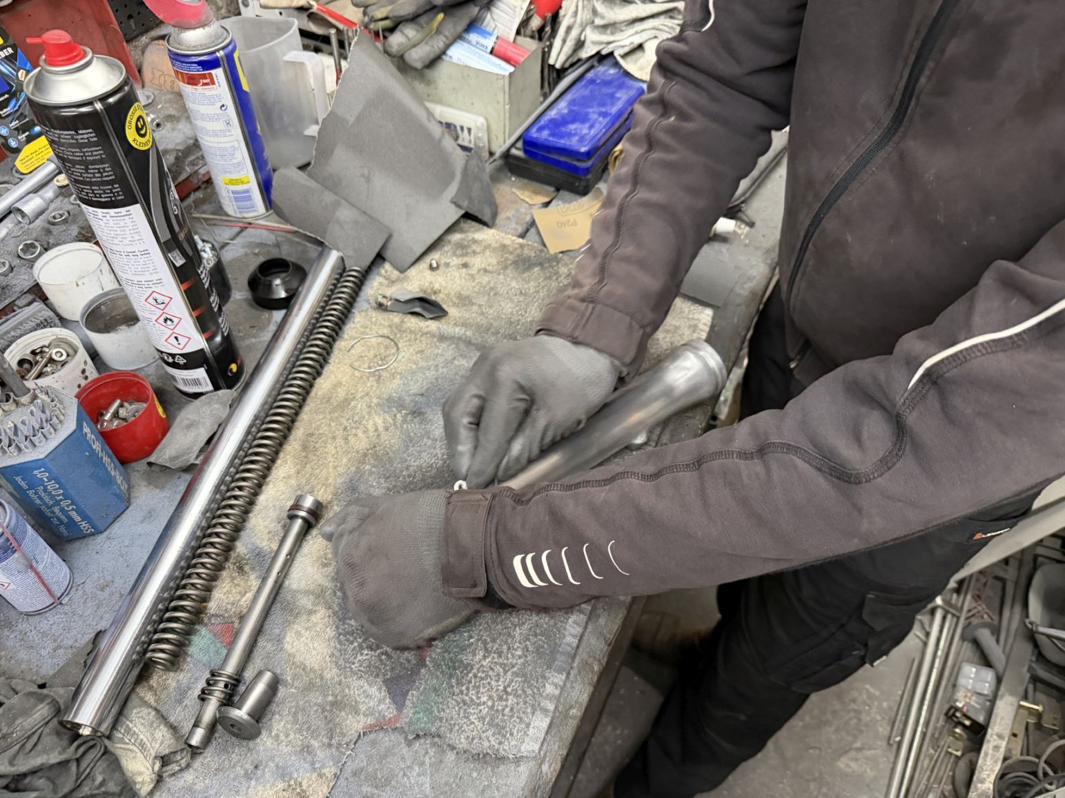 11.01.2026 - Am Sonntag Nachmittag geht's weiter, Dieter zieht sich ein Ganzkörper- kondom an und poliert das Tauchrohr am Schleifbock. Aber er passt einmal nicht richtig auf, das Tauchrohr verhakt sich kurz an der Polierscheibe und schlägt gegen die Maschine - ein paar Macken zieren nun das fast fertige Teil - ärgerlich! Wir können die Macken fast komplett beischleifen, dann wird erneut poliert. Das Ergebnis sieht trotz des Rückschlags ziemlich gut aus. Nach dem Reinigen sollen die Gabelteile wieder zusammengesetzt werden, aber irgendwie erschließt sich die Funktion der unteren kleinen Feder nicht so ganz. Erst der Blick in Teilekatalog und Handbuch sowie das Zerlegen einer defekten Gabel aus meinem Fundus klärt die Lage. Aber es gibt ein weiteres Problem: Der kleine "Kolbenring" rund um den Dämpferkolben ist ganz schön verschlissen, wir brauchen Ersatz. Der ist aufzufinden, mit gut 8 Euro pro Stück nicht ganz billig, aber alternativlos. Wir ordern 4 Stück, 2 davon werden bei passender Gelegenheit die Gabel meiner CB zieren. Also erstmal abwarten, bis die neuen Teile an Land kommen, dann geht's weiter.