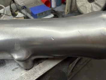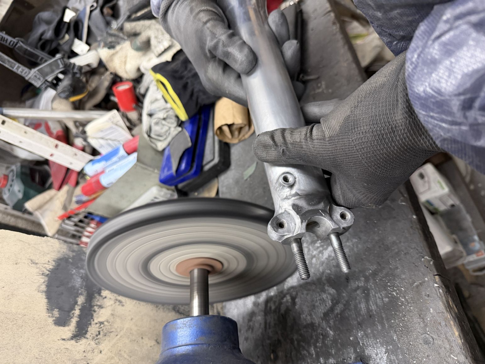 03.01.2026 - Dieter nimmt sich etwas Zeit, so auch ich: Er hat einen kompletten rechten Gabelholm ergatttert, den arbeiten wir nun auf, da die Gabel immer noch undicht ist, wie sich seit der Inspektion und dem dazugehörigen Wechsel des Gabelöls gezeigt hat. Wir zerlegen die Gabel, dann wird das Standrohr auf Verzug geprüft - alles gerade. Dann werden die Teile gereinigt und anschließend das Aluminium von den Spuren eines langes harten Lebens befreit, was bedeutet: Schleifen, schleifen und nochmals schleifen... Ich arbeite unterdessen an der hinteren Nabe meiner SL 350, die mir Freund und Schrauberkollege Holger bereits vor einiger Zeit mit einem neuen Stahlring für die Bremstrommel versehen hat. Das Polieren der Teile schenken wir uns aber, sonst wird's zu spät.