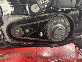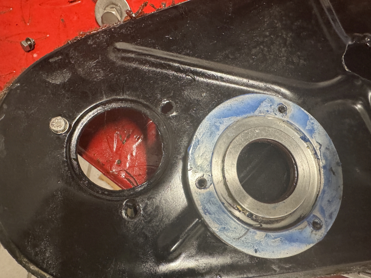 07.10.2025 - Ich reinige die beiden Prmärdeckelhälften so gut es geht, dann wird frisches Baumarktsilikon auf die dicke Gummidichtung geschmiert, der Deckel fixiert und zusammengesetzt. Das muß jetzt erstmal ein paar Tage trocknen, bevor ich Öl in den Primärtrieb füllen kann. Linke Fußraste dran, das Bremspedal wieder anbauen und mehr geht erstmal nicht, ich helfe Dieter bei der Inspektion der CB250.